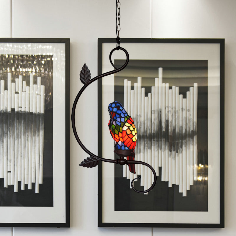 Victorian Stained Glass Parrot Pendant Light Kit - 1-Light Yellow/Blue Ceiling Suspension Lamp With