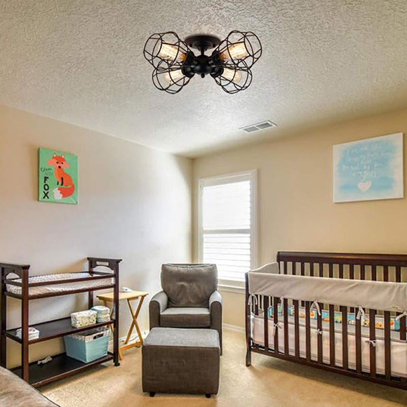 Metal Industrial Pendant Light With Cage Shade - Semi Flush Mount For Living Room (4 Heads Black)