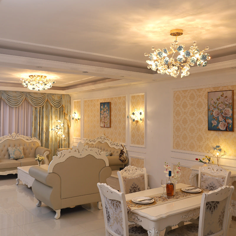 Pastoral Rosebush Ceiling Light: Ceramic Semi Flush Fixture With Crystal Accents 7 / Blue