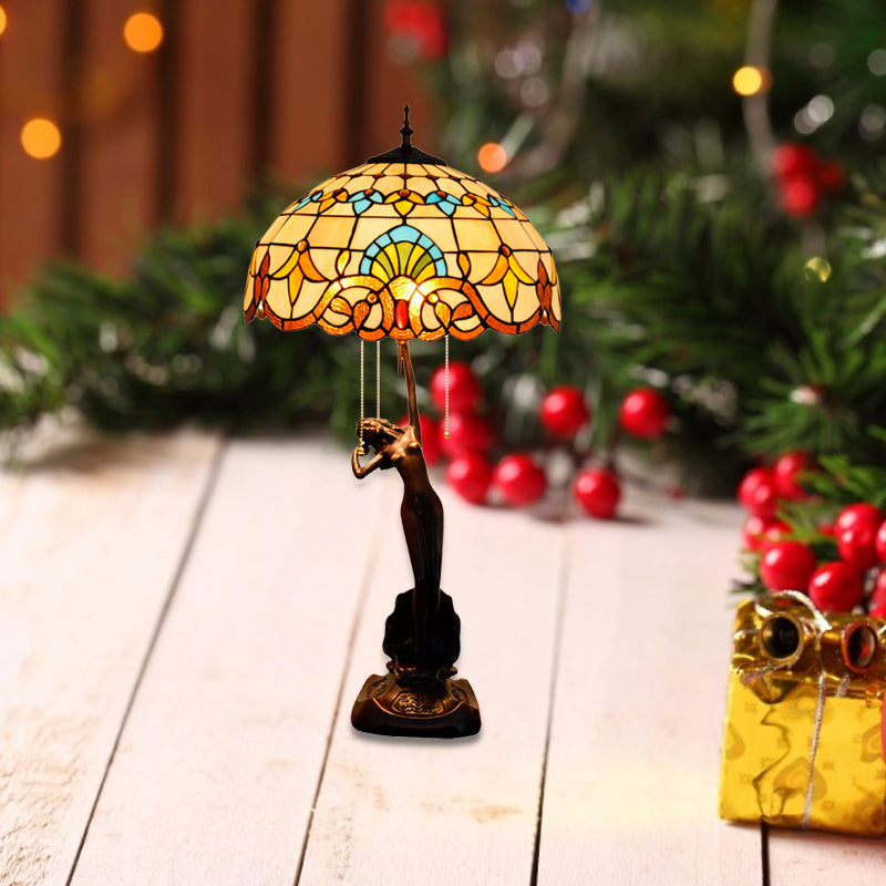 3-Head Mediterranean Spikelet & Blue/White Glass Nightstand Lamp With Pull Chain Beige