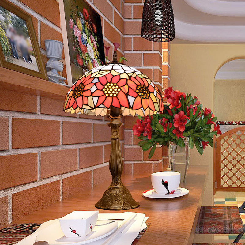Orange Stained Glass Nightstand Lamp - Bowl Shade Sunflower Pattern Classic Table Lighting