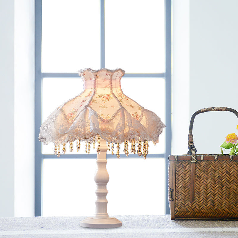 Europäische weiße Nachttischlampe mit Blumen-/Spitzenstoff und Drapierung – Elegante Wohnzimmerbeleuchtung