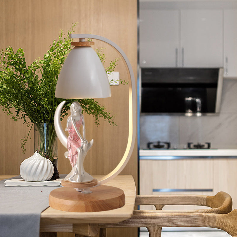 Nordic Style 1-Bulb Metallic Desk Lamp With Bell Shade White/Black Finish And Girl Decor