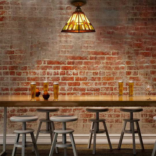 Antike Messing-Deckenleuchte mit Kunstglasschirm, halbbündige Pyramidenmontage für den Flur