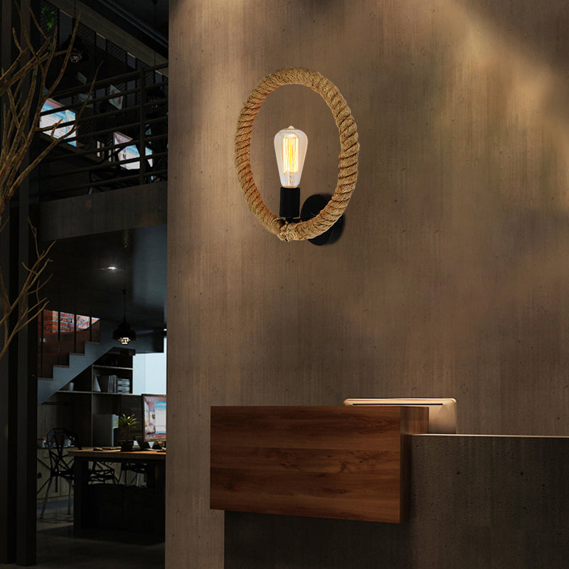 Schwarze Bauernhaus-Wandleuchte mit Seilring und offener Glühbirne, 1 Licht, Flurlampe