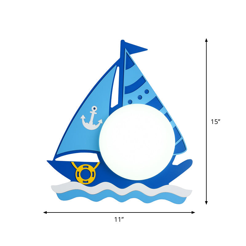 Nautische LED-Wandleuchte aus Holz mit blauem Schiffsdesign und Opalglasschirm in warmweißem Licht