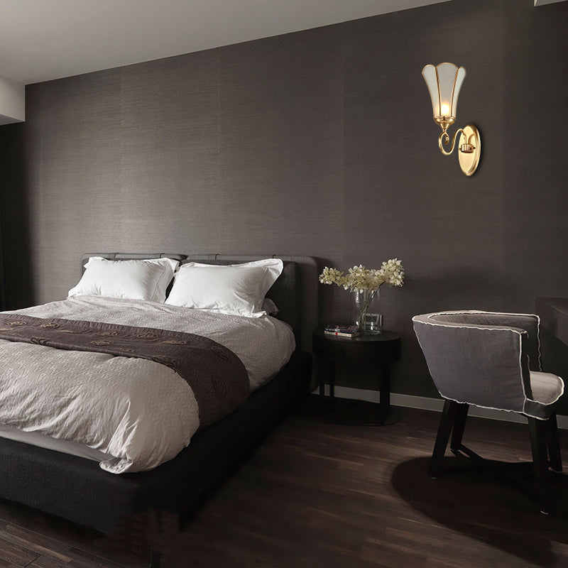 Florale Wohnzimmer-Wandlampe – Traditionelles Metalldesign mit Messing-Finish und weißem Glasschirm mit Facettenschliff