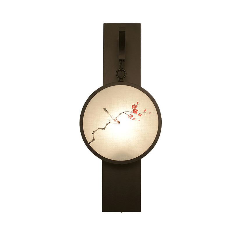 Chinesische Stoff-Teestube-Wandlampe: Blumen-/Vogel-LED-Wandleuchte in Schwarz