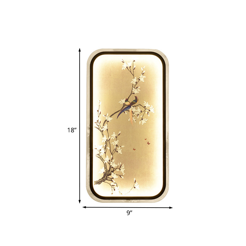 Helles asiatisches Wandbild mit blühendem Baum: Schwarze Wandleuchte aus Stoff für stilvolle Dekoration