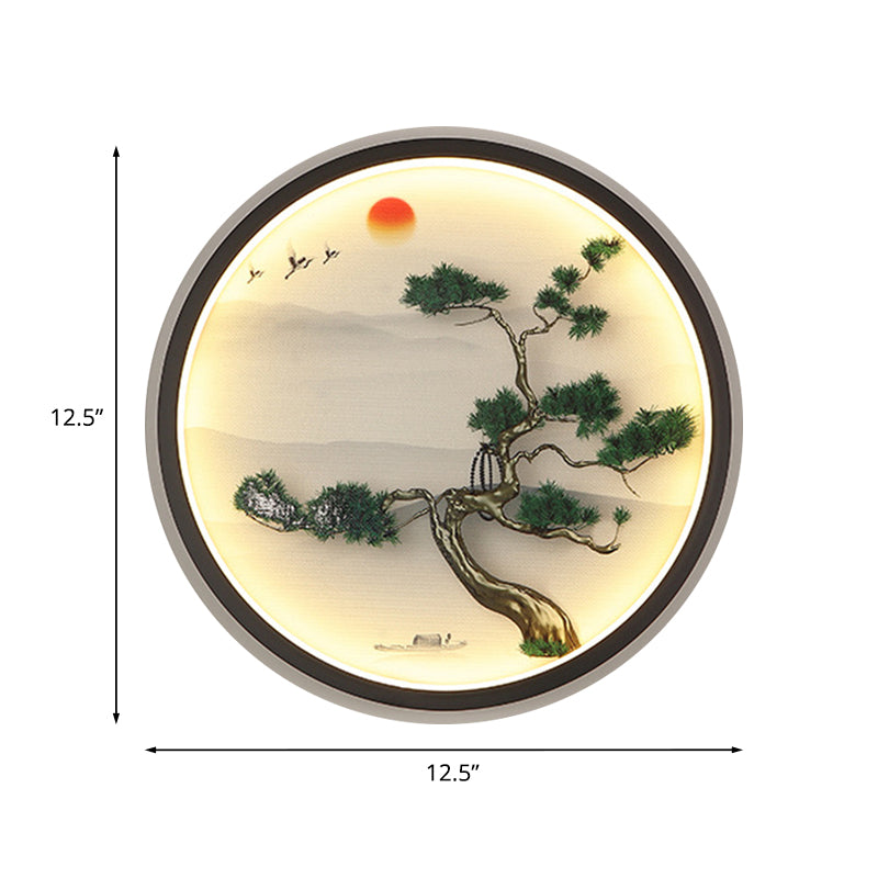 Moderne asiatische LED-Wandleuchte aus Metall mit grünem Kiefernholz-Wandbild und schwarzem runden Rahmen