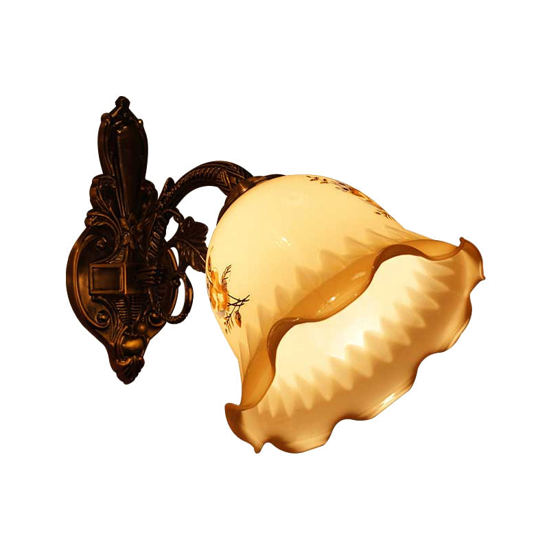 Diese Wandleuchte ist in drei verschiedenen Größen erhältlich: 5", 7" und 9". Der Glasschirm ist aus Opalglas, was ihr ein weiches und elegantes Aussehen verleiht. Diese Leuchte ist perfekt für einen Raum im Shabby-Chic-Stil oder jeden Raum mit Vintage-Flair. Die Wandleuchte ist aus Metall und hat ein Bronze-Finish. Diese Leuchte kann direkt in die Wand verdrahtet oder an eine Steckdose angeschlossen werden. Sie benötigt eine Spannung von 220–240 V oder 110–120 V. Die Leuchte hat außerdem einen gerüschten Rand, der ihr ein romantisches und antikes Flair verleiht. Die Höhe der Leuchte beträgt 10–14 Zoll und die Tiefe 10,5". Die Breite beträgt 6,5". Diese Leuchte wird ohne Glühbirne geliefert, hat aber einen E26/E27-Sockel.
