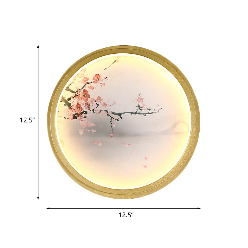 Hand-Painted Floral Mural Led Wall Sconce With Chinese Fabric Gold Frame - Perfect For Living Rooms