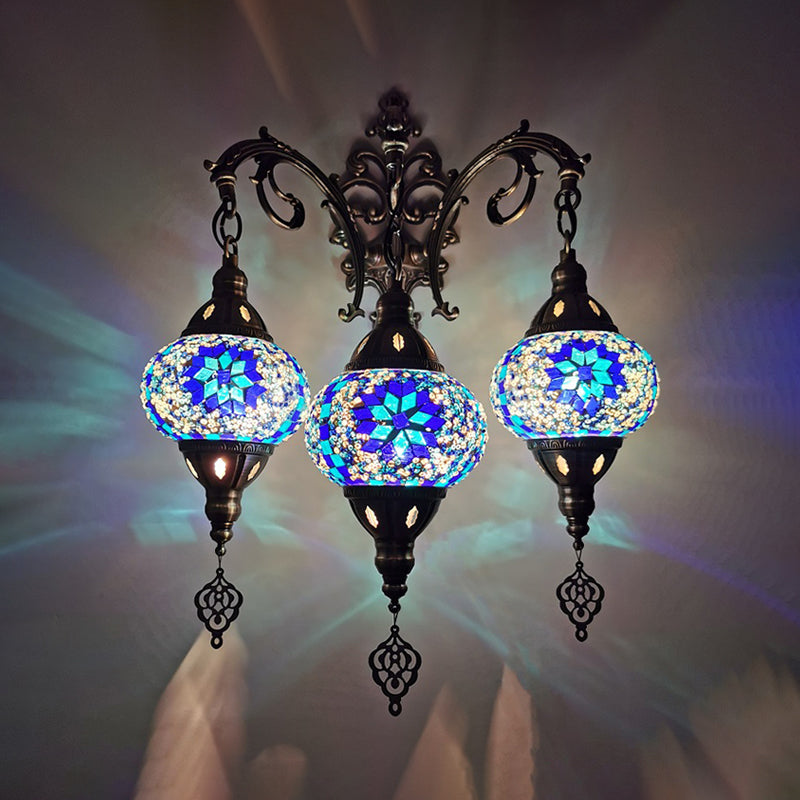 Traditional 3-Head Oval Hand Cut Glass Wall Light In White/Red/Yellow For Living Room Sconce Blue