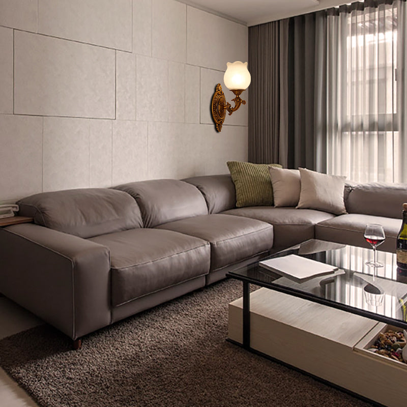 Stilvolle Wandleuchte aus Milchglas mit Blütenblatt und 1 Glühbirne – Traditionelle Wandhalterung fürs Schlafzimmer in Gold