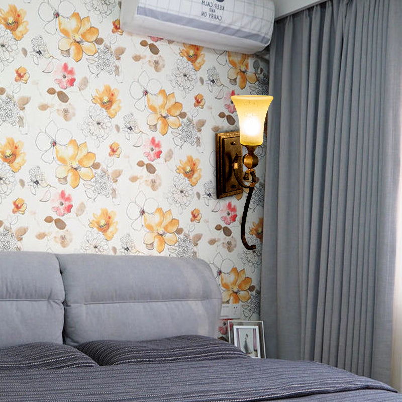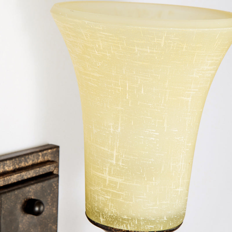 Wandleuchte aus Metall in Antik-Bronze mit bernsteinfarbenem Glasschirm – Lodge-Leuchte