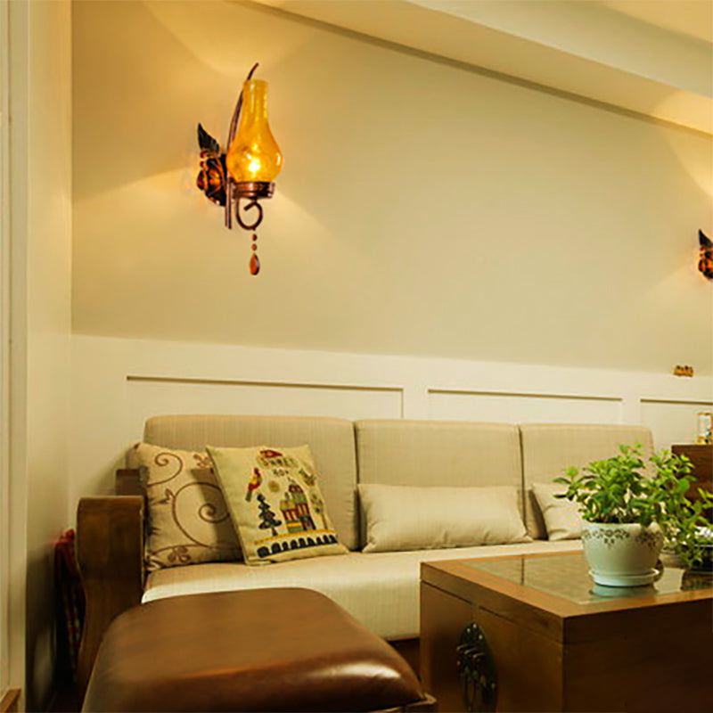 Hellgelbe Wandhalterung aus rissigem Glas mit orangefarbener Kristalldekoration – 1-flammige Badezimmer-Wandleuchte