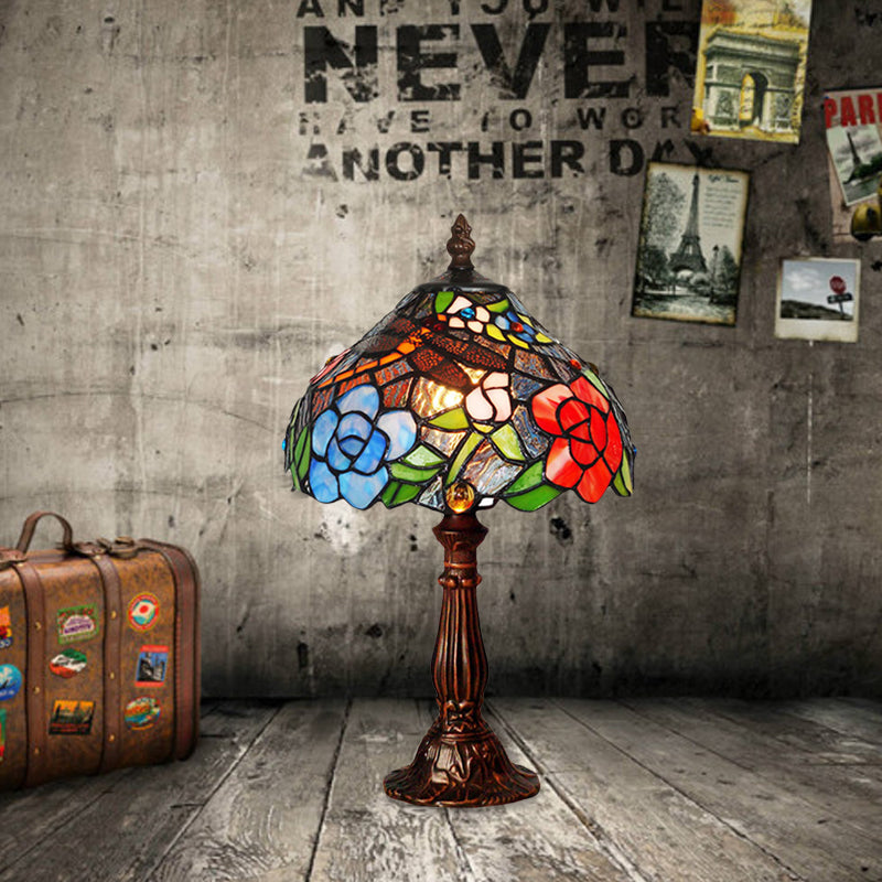 Die Stehleuchte verfügt über einen mehrfarbigen Glasschirm im Tiffany-Stil. Der bronzefarbene Metallkörper ist 23 cm breit und 20 cm hoch. Die Stehleuchte verwendet E12/E14-Glühbirnen mit einer maximalen Wattzahl von 40 Watt und ist mit LED-, Glüh- und Leuchtstofflampen kompatibel.