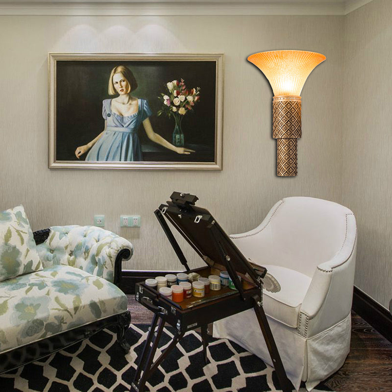 Wandlampe im Lodge-Stil aus gelbem Glas und Harz – 1-flammige Wandleuchte mit Glockenschirm für das Wohnzimmer in Gold