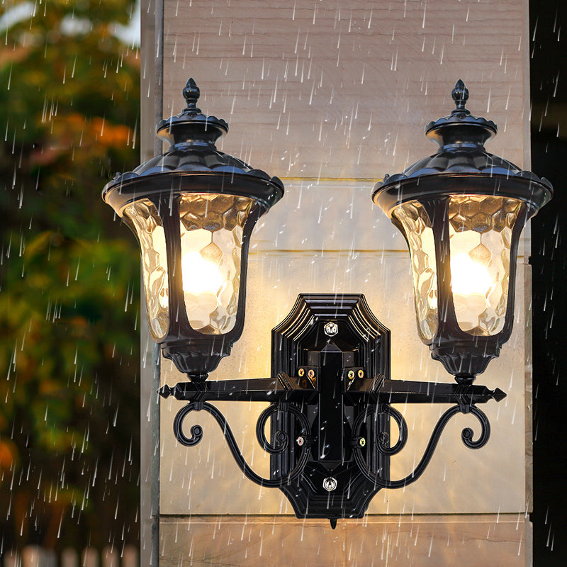 Traditionelle Wandleuchte mit Urnenschirm aus klarem Grübchenglas – 2 Glühbirnen zur Wandmontage in Schwarz