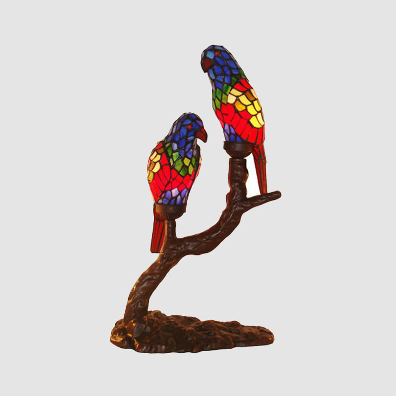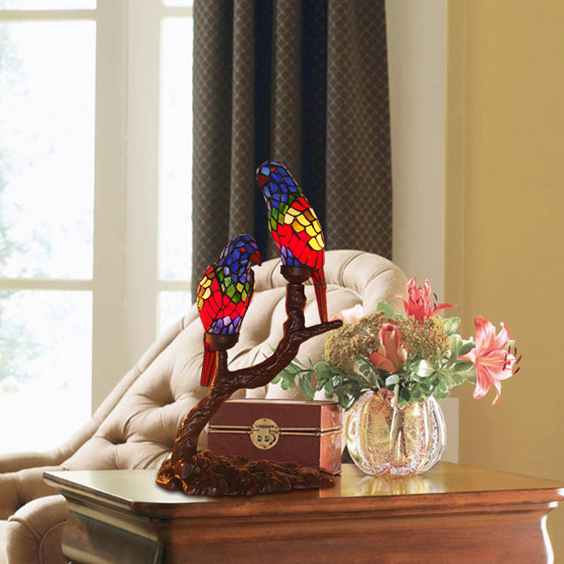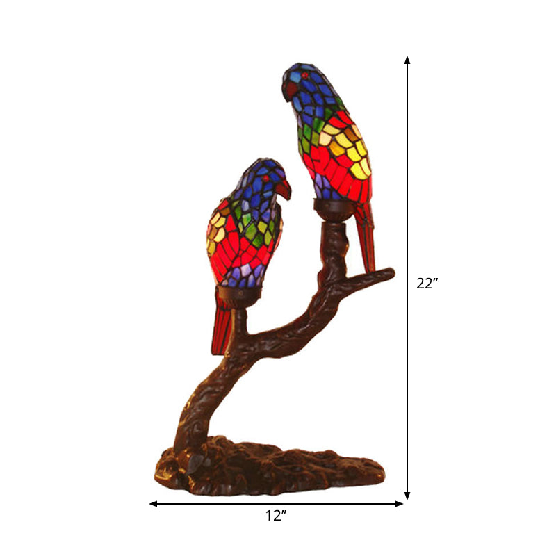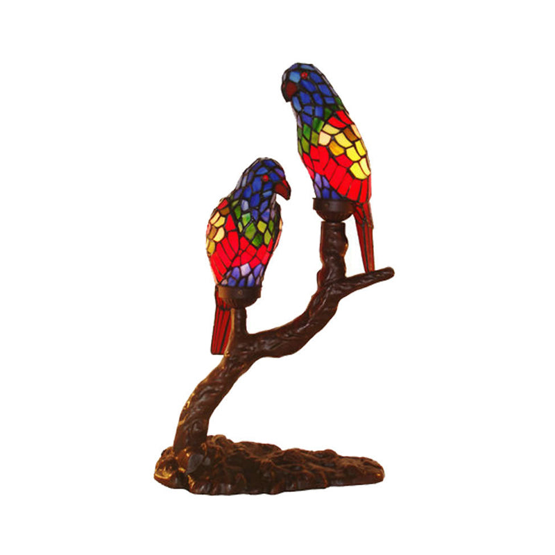 Tiffanyblaue verzweigte Nachttischlampe mit Schirm aus geschliffenem Glas im Papageienstil, 2er-Set