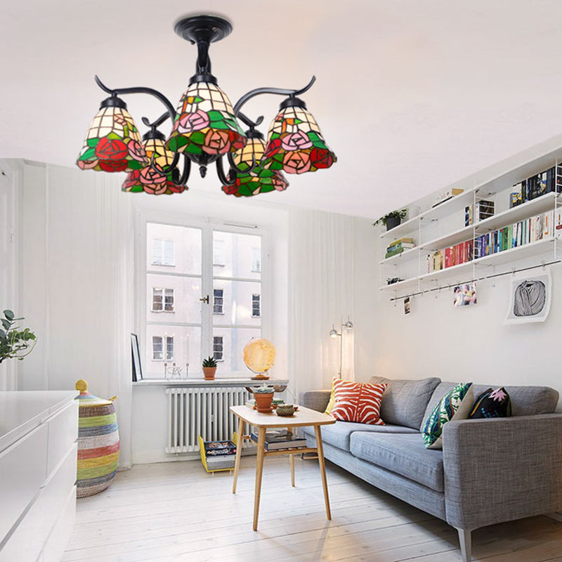 Tiffany Style Stained Glass Semi Flush Lamp - Red/Blue/Green/Blue-White 3/5 Lights Ideal For