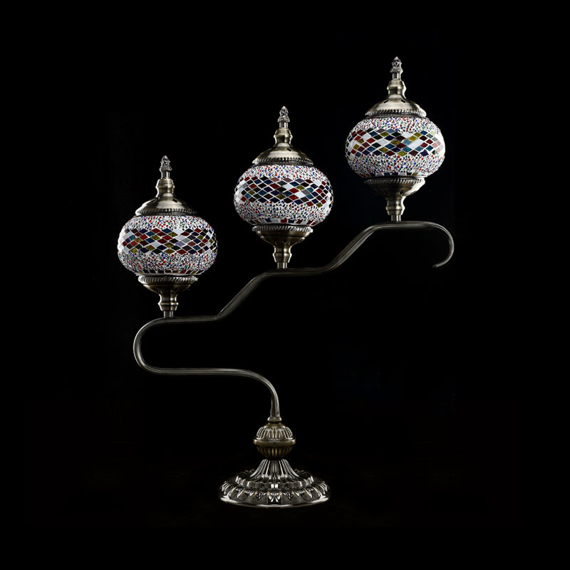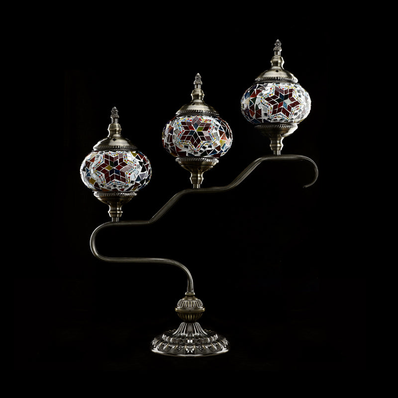 Mediterranean Stained Glass Night Light With 3 Heads - Red/Orange/Blue Tower Design Gold