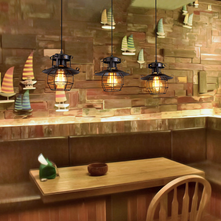 Vintage Industrial Black Metal Pendant Light With Dome Cage Shade And 3 Hanging Lights / Round