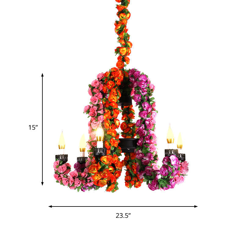 6-flammiges Hängeleuchten-Set aus Metall: Lila Kronleuchter mit geschwungenen Armen und Blumendekor – Industrielle Restaurantbeleuchtung