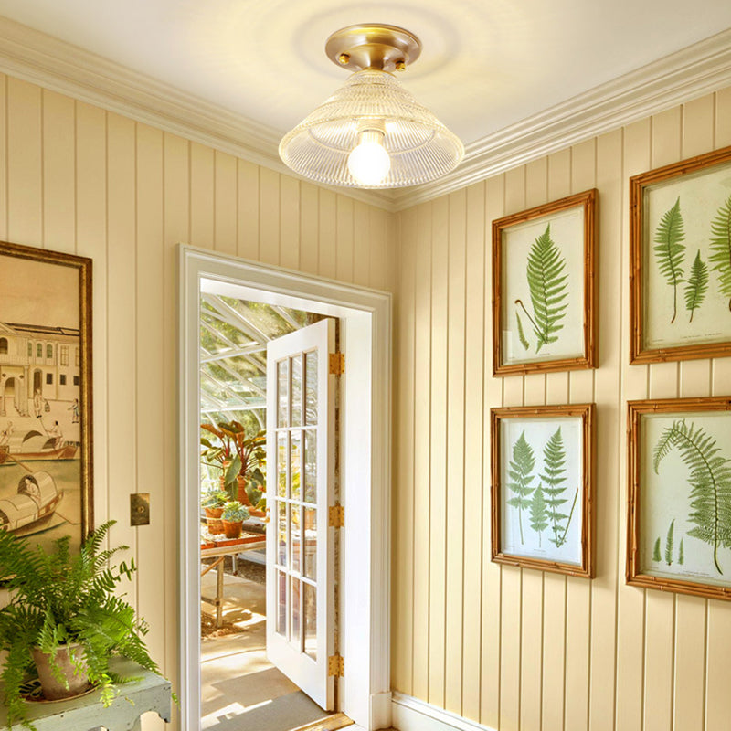 Deckenleuchte aus klarem, geripptem Glas im Kolonialstil aus Messing – 7,5"/8" Breite, kegel-/glockenförmige Deckenleuchte, Einzelbirne, ideal für den Flur