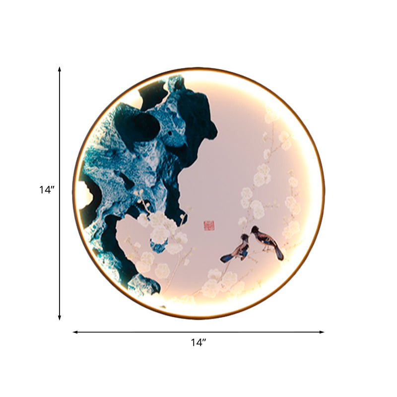 Schwarze Halcyon LED-Wandleuchte – Asiatisch inspiriertes Berg- und Kiefernbaum-/Vogelgemälde – Verbessern Sie die Atmosphäre mit Stoffschirm