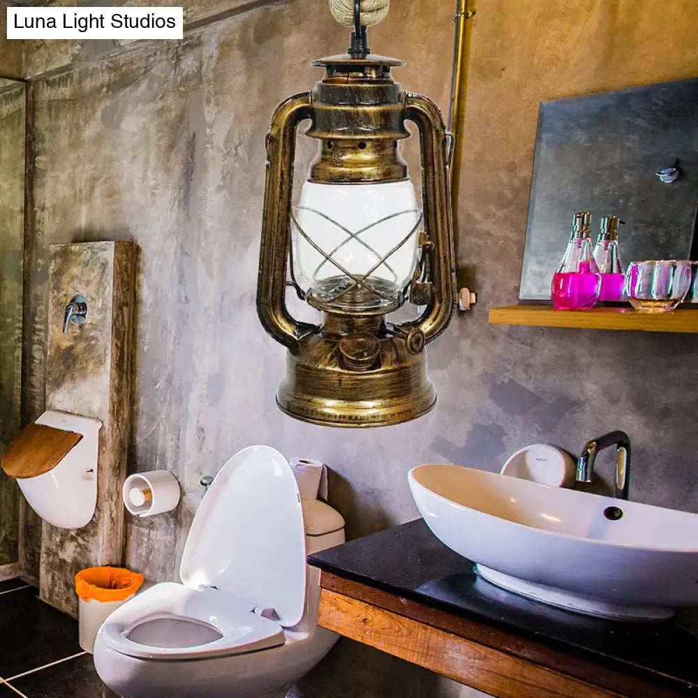 Dies ist eine wunderschöne Pendelleuchte mit einer Leuchte in Schwarz, Bronze oder Antikmessing. Sie hat einen klaren Petroleum-Glasschirm und eignet sich perfekt für ein Café oder eine industrielle Umgebung. Sie hängt an einer Metallkette und verfügt über einen E26/E27-Sockel, sodass sie mit LED-, Glüh- oder Leuchtstofflampen kompatibel ist.