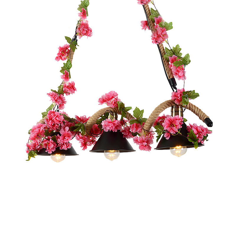 Schwarze konische Pendelleuchte aus Metall mit gedrehtem Seil und Kunstblume – 3-flammige Deckenleuchte für Restaurants und Lagerhallen