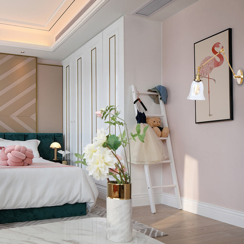 Diese Wandleuchte aus Messing mit ausgestelltem Gestell ist eine einflammige Wohnzimmerleuchte im Vintage-Stil mit klarem, strukturiertem Glasschirm und verleiht Ihrem Zuhause einen Hauch von Eleganz. Das Metallgehäuse und der industrielle Stil sorgen für einen klassischen, zeitlosen Look, der in jedem Raum auffällt. Der Schirm hat einen Durchmesser von 12,7 bis 23,9 cm und besteht aus klarem Glas, wodurch beim Anzünden ein weicher, diffuser Effekt entsteht. Das Metallgehäuse hat ein stilvolles Finish und einen Schwenkarm, der den traditionellen Stil zusätzlich unterstreicht.