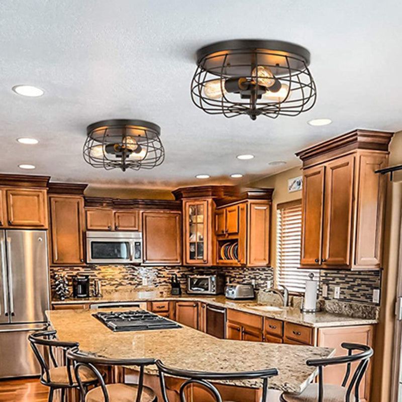 Retro Industrial Metal Ceiling Light Fixture For Hallway - Cage Drum Flush Mount Lighting