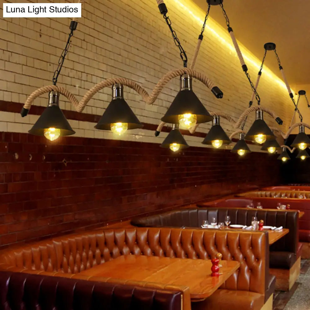 Diese kegelförmige Insel-Deckenleuchte verleiht jedem Raum eine rustikale Note. Die Deckenleuchte aus Metall verfügt über ein braunes Seil und eine Kette, die ihr einen industriellen Touch verleihen. Die Leuchte eignet sich perfekt für jeden Raum, der etwas Licht benötigt, ohne die übrige Einrichtung zu beeinträchtigen. Die Leuchte ist auch in Weiß erhältlich.