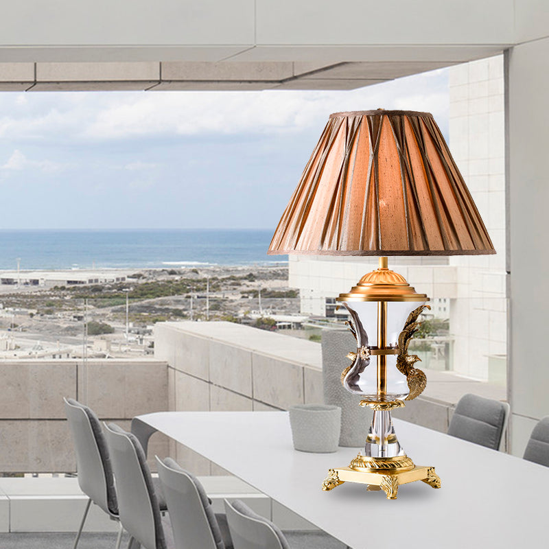 Modern Curved Desk Lamp With Clear Crystal Shade - Light Brown Night Table