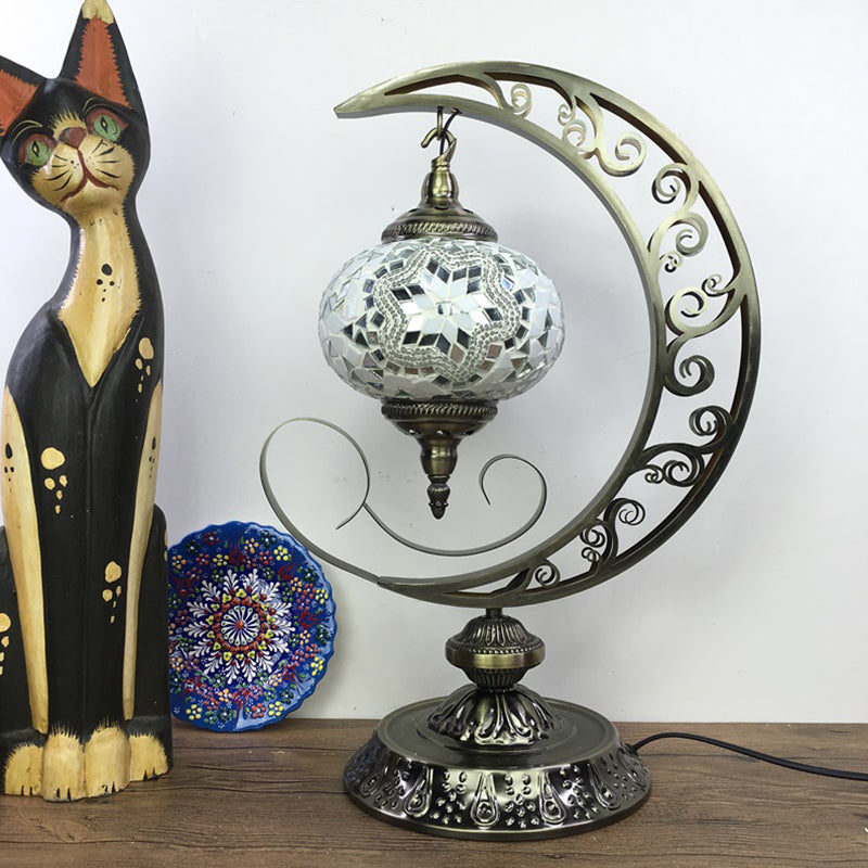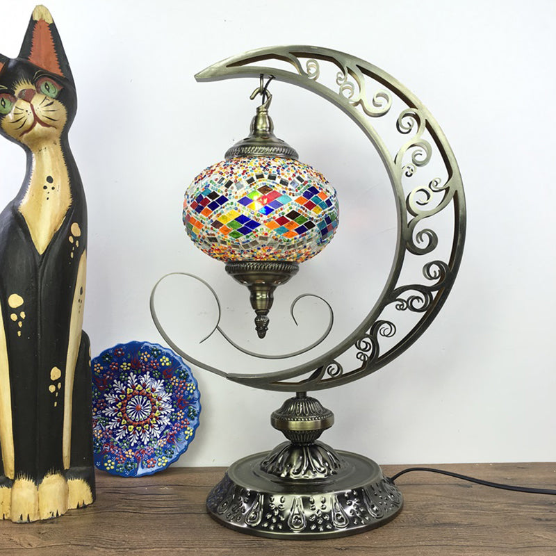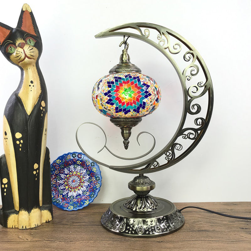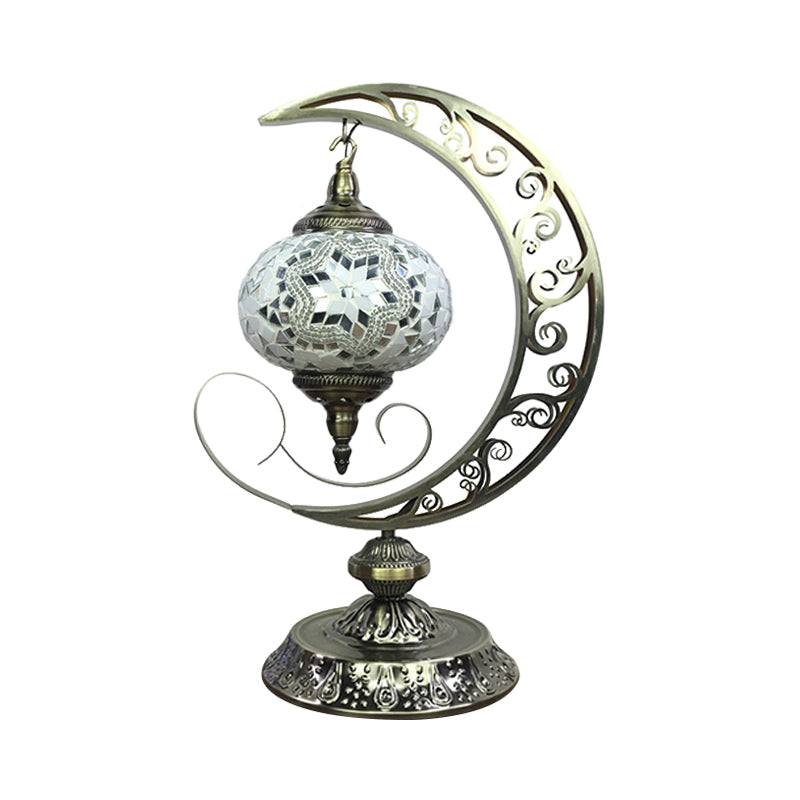 Stained Glass 1-Light Nightstand Lamp With Moon Design - Global Decor White/Red/Pink Desk Light Dark