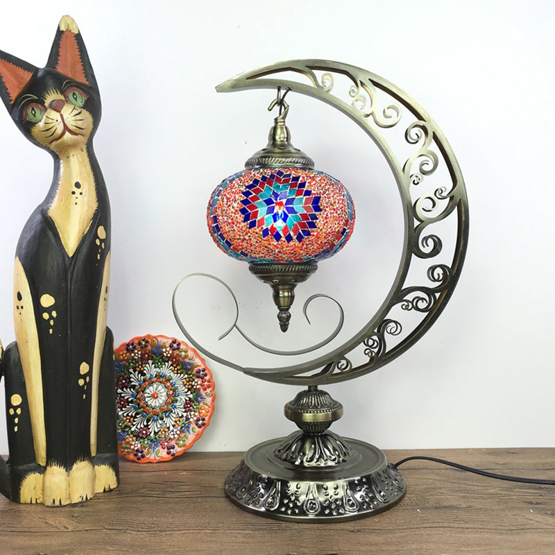 Stained Glass 1-Light Nightstand Lamp With Moon Design - Global Decor White/Red/Pink Desk Light Red