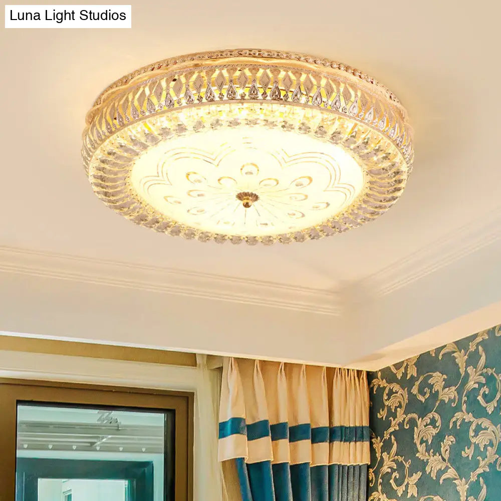 Moderne goldene LED-Deckenleuchte mit Kristallakzenten und Milchglasdiffusor