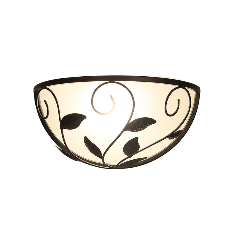 Die Half Moon Schlafzimmer-Wandleuchte ist eine Vintage-Wandleuchte aus weißem Glas mit schwarzem Finish und Blattdesign. Sie verfügt über eine Leuchte und ist ideal für Schlafzimmer, Flure und andere Wohnbereiche.