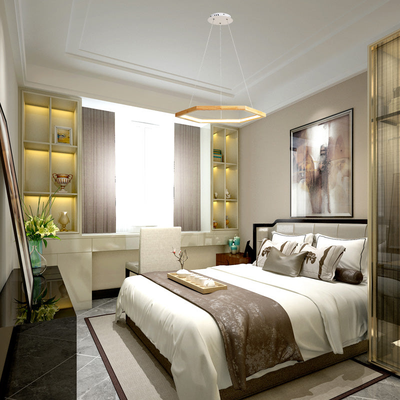 Moderner sechseckiger Kronleuchter aus Holz und Acryl mit LED-Beleuchtung, 16"/19,5"/23,5" breit