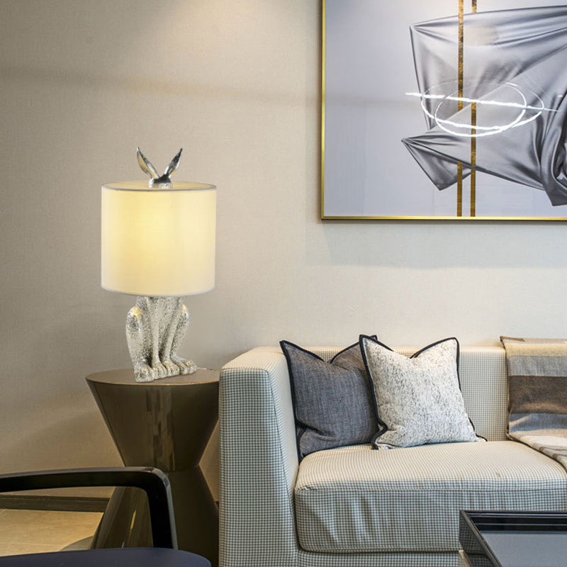 Rabbit Nightstand Lamp - Decorative Resin Bedside Table Light With Fabric Shade Silver