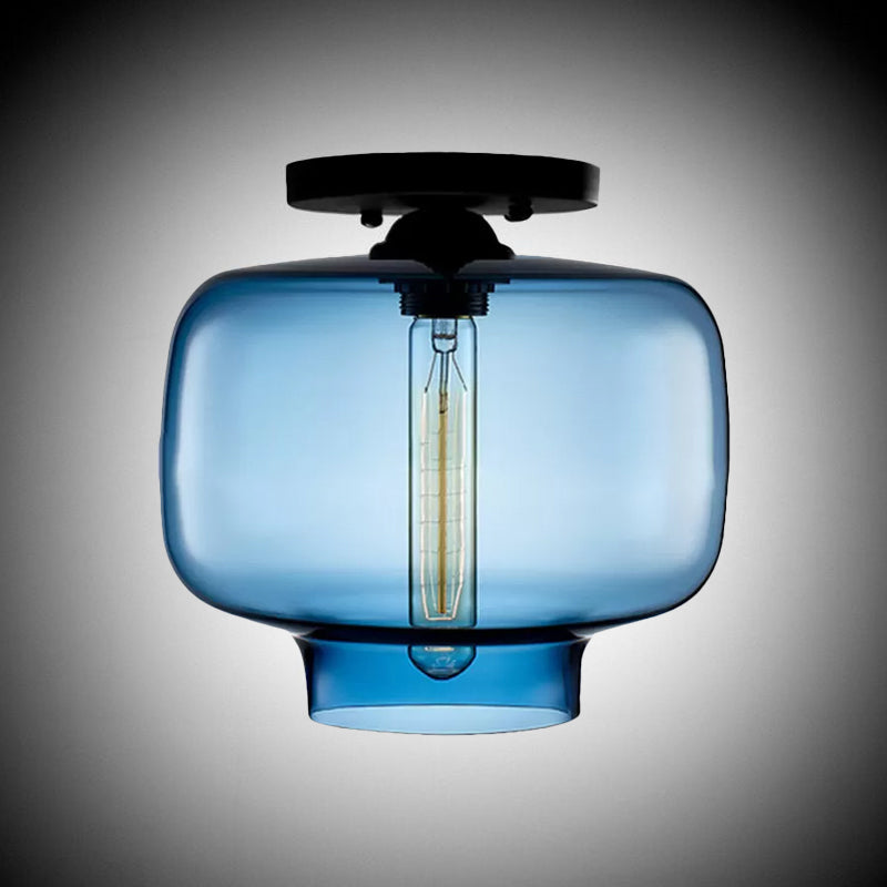 Modern Multi-Colored Lantern Flushmount Light With Glass Shade - Black Finish Sky Blue
