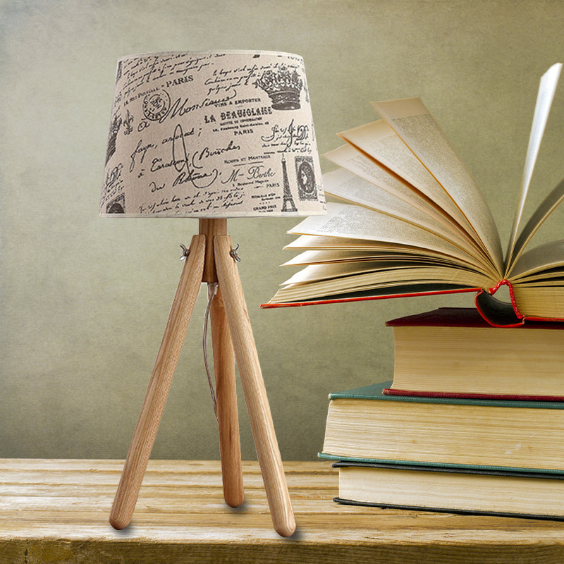 Modern Wood Tripod Desk Light In Beige For Hotel - Tapered Shade With Reading Bulb