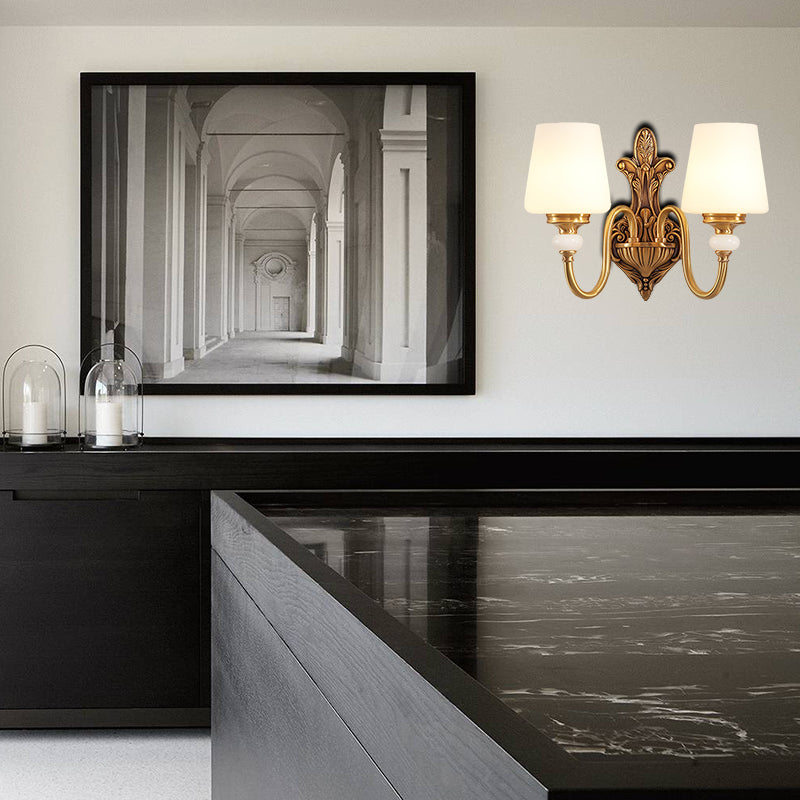 Vintage-Style Opal Glass Tapered Sconce Light With Golden Gooseneck Arm - Bedroom Wall Mount 2 /