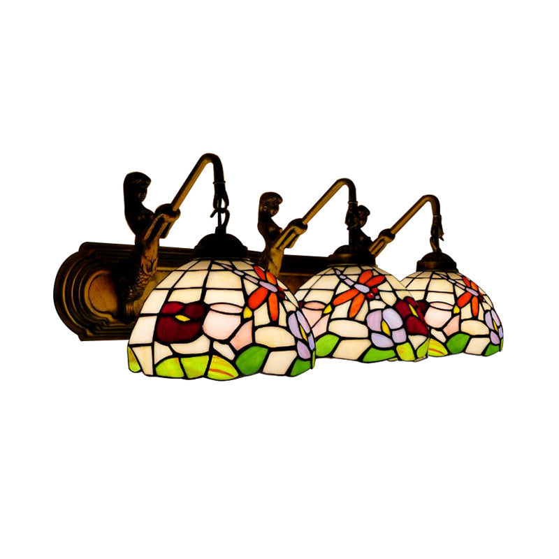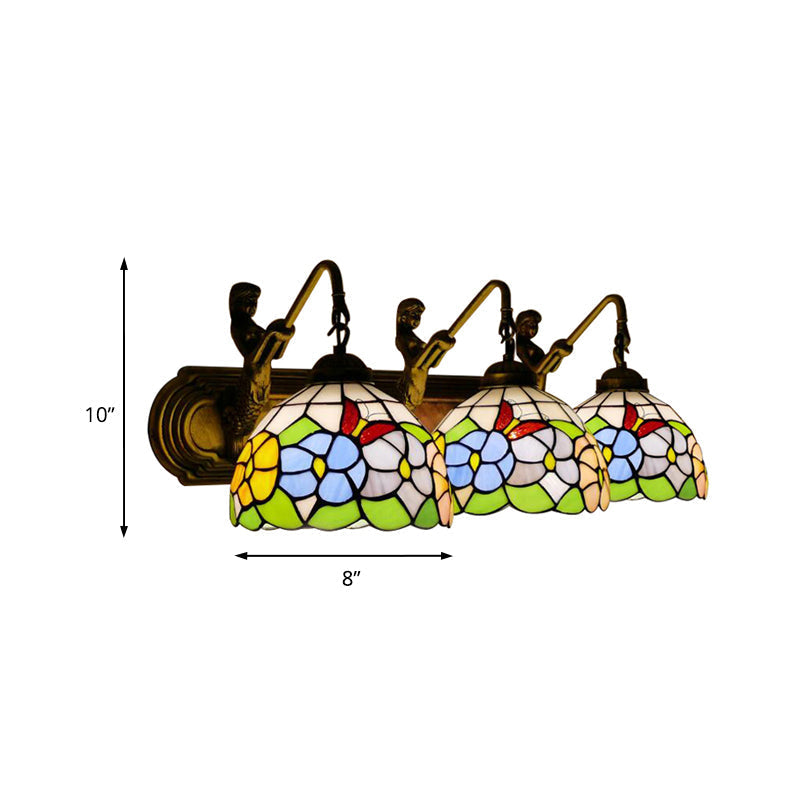 Antique Brass Peony Sconce Lighting With Tiffany Blue/Pink Glass - Wall Mounted 3 Lights Blue