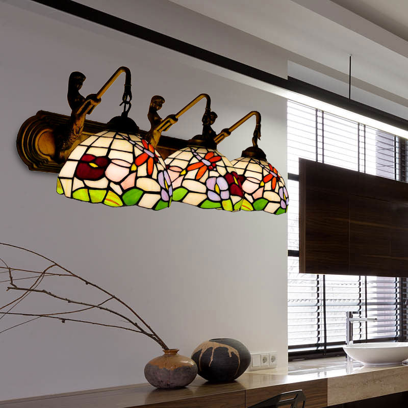 Antique Brass Peony Sconce Lighting With Tiffany Blue/Pink Glass - Wall Mounted 3 Lights