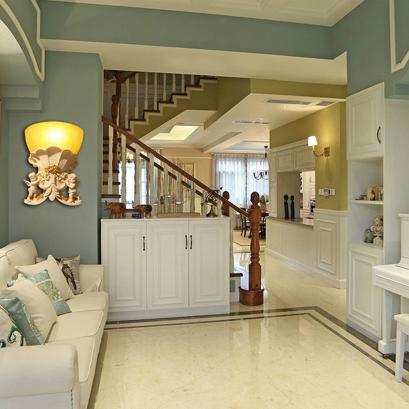 Moderne Wandleuchte in Engelform aus Kunstharz, für den Innenbereich, Beige/Gold/Weiß-Finish mit gelbem Glasschirm