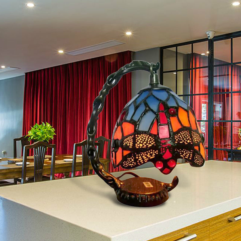 Rustic Mini Table Lamp With Curved Arm In Bronze & Stained Glass Perfect For Bedroom / Dragonfly