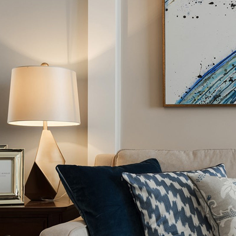 White Geometric Night Lamp - Luxury Metal Table Lighting With Barrel Fabric Shade
